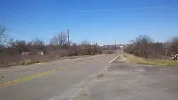 Iowa 46 began at the intersection of SE 64th Avenue and SE 45th Street in rural Polk County near the unincorporated community of Avon. Iowa 5 formed the western and southern legs of the intersection, SE 64th Avenue continued east, and Iowa 46 headed north along a two-lane highway. As it climbed a 40-foot (12 m) hill, the roadway formed the western edge of Avon. On the other side of the hill, it descended 100 feet (30 m) into the Des Moines River valley. A single line of the Union Pacific Railroad,[2] which, before 1980, was owned by the Rock Island System, passed under a bridge near the base of the hill.[3]