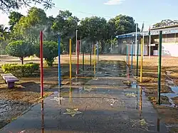The walking and biking paths that intercede the park allow direct access to nearby neighborhoods, such as Canaã and Iguaçu.[13][14] Besides the lake, there are soccer fields, courts, an amphitheater and a playground for children inside the park.[10] Next to the leisure area is the Science Park, where physical, biological, chemical and astronomical phenomena can be observed or interacted with by the visitor.[10] In the same space as the Science Park and the playground are also the "whispering corner", the "path of the stars", the "water cloud" and the sundial.[15]