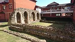 The Blackfriars church, which was dedicated to St Mary, disappeared within a century after the Dissolution, but the layout of the other conventual buildings, including some of the original structures, survived long enough to be illustrated and planned by Joshua Kirby in 1748.[2] By that time later uses had supervened and their interpretation had become confused.[3] The last of the monastery buildings, the former sacristy, chapter house and dormitory, continued in use as a schoolroom for the Ipswich School until 1842 before finally being demolished in 1849. In 1898 Nina Layard had some success in locating buried footings.[4] A modern understanding of the site emerged during the 1970s and 1980s, through scholarly interpretation and in excavations by the Suffolk County Council team,[5] by which the position of the lost Blackfriars church was recognized and revealed, much of the original plan was clarified or confirmed, and former misapprehensions were corrected.[6][7]