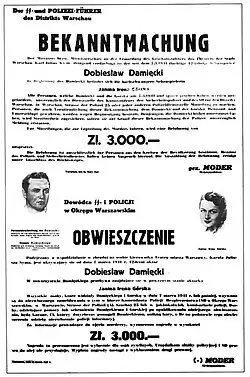 In 1940, Górska married actor Dobieslaw Damięcki, who was married when they met to actress and dancer Jadwiga Hryniewiecka. The following year, the actor and Nazi collaborator Igo Sym was killed by members of the Polish resistance movement after he named Hanka Ordonówna to the Gestapo. Following Sym's assassination, over 100 actors were rounded up by the Gestapo, and the people of Warsaw were given three days to turn over the perpetrators. Górska-Damięcka and her husband, under suspicion though innocent, fled the city two hours before the Nazis searched their home; 21 of those arrested were executed.[4][5] A bounty of 3,000 Polish złoty had been issued for their arrest. The couple lived through the rest of World War II in Ostrowiec Świętokrzyski, changing hiding places and under false documents, using the name Bojanowski.[6]