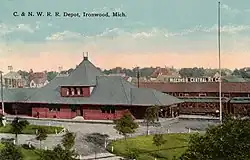 The Chicago and Northwestern Railroad Depot in Ironwood is a red brick and sandstone structure[3] with a one-block long platform.[5] It has a multi-level hipped roof covered with slate.[3] The depot consists of a single-story main depot with a small second story space in the center and a separate, single-story baggage unit with a small modern addition. The two portions are joined with a single roof and measure approximately 175 feet by 28 feet.[2]