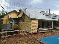 Due to a need for more space, another extension was made to the teaching building, also to a design by the Department of Public Works.[40] August Conrad Ferdinand Ohnesorgen's tender of £527 5s was accepted in December 1905 and construction was completed in 1906.[41] Attached to the end of the 1899 classroom, the extension was similar to the earlier building but was oriented at right angles and introduced further lighting and ventilation methods. It was a single-skin timber-framed building clad with weatherboards and had a gable roof. The gable end walls had packed weatherboards in the gable end apexes to vent the interior. Accommodating one classroom 34 by 18 feet (10.4 m × 5.5 m), it had a coved ceiling and tall, highset windows on all sides. The teacher's residence was also extended in 1906.[1]