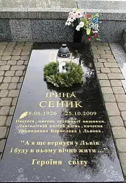 Iryna Senyk (Ukrainian, Іри́на Миха́йлівна Се́ник; June 8, 1926, Lviv - October 25, 2009, Boryslav) was a Ukrainian poet, nurse, and Soviet political dissident.[2] She was imprisoned in Stalinist camps as were her mother and brother.[3] She was a member of the Ukrainian Helsinki Group and an honorary member of PEN International.