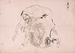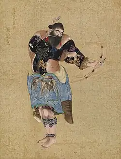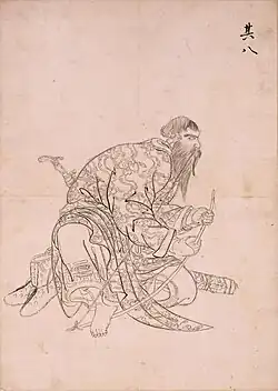 with his sanpaku eyes, he sits on bear[10]: 158  or sea otter[11][1]: 121  skins, his Ezo nishiki robe — with dragons, clouds, and waves, worn right over left — rides up, revealing his hairy legs; in his hands is an item of jewellery with tassels and beads[10]: 158