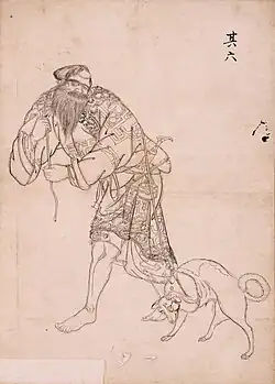 wearing an attush over his Ezo nishiki robe, barefoot, and walking a dog, he has a tobacco case and tashiro sword[10]: 158