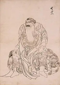 Mautarake, with a beard, unbound hair, synophrys, sanpaku eyes, large ears and nose, and a hairy body; his robe is wrapped right over left
