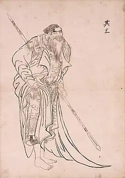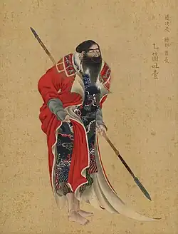 with a spear and bare-legged, he wears a Russia greatcoat over his Ezo nishiki robe[1]: 121