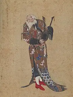 with European stockings and shoes under his fur-lined Ezo nishiki robe,[4]: 100  he wears blue bead and cloth tassel earrings and holds a hoe-shaped helmet ornament[1]: 121  (as does the chieftain Tobu in Kakizaki Hakyō's 1783 portrait (see Gallery below))