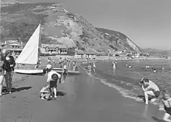 In the early days of European settlement George Hunter was the chief proprietor of the Island Bay Estate, where he bred stock on his stud farm. The Island Bay portion was subdivided and auctioned in March 1879.[13] In the late 19th century, Island Bay was settled by Italian and Shetlander fishermen. In 1905, Wellington's tramline was extended to Island Bay, increasing the area's popularity, and steadily transforming it into a seaside suburb. Many Island Bay villas, bungalows and shops date from the 1920s, a period of rapid development for the area.[14] This included the Island Bay Racecourse which was approximately 2km running down Clyde and Derwent Streets, and bounded by Medway and Humber Streets encompassing parts of Mersey Street and Thames Street.[15] Many streets in Island Bay were named after British and European rivers.