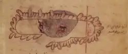 It subsequently appeared in the world map of the 11th-century Book of Curiosities, where it is labelled "The Island of the Jewel, and its mountains encircle it like a basket"[9][14] or "like scales"[15][16], and in other medieval Arabian and Persian texts.