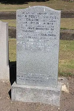 - ^ "Jeanie Wylie Hutchison grave monument details at Municipal Cemetery, Kirkliston, West Lothian,Scotland". www.gravestonephotos.com. Retrieved 17 April 2022.