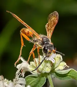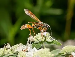 Isodontia elegans, also known as the elegant grass-carrying wasp, is a species of solitary, nest-provisioning,[2] thread-waisted wasp in the family Sphecidae that hunts orthopterans (grasshoppers, crickets, bush crickets, locusts, etc.).[1][3][4][5]