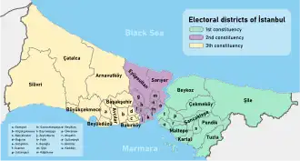 The first district is situated on the Anatolian side of İstanbul on the east of the Bosphorus. The second and third electoral district are both on the European side, with the third situated to the west of the second. The first and third districts, electing 35 MPs, are the largest electoral districts of Turkey in terms of members elected.