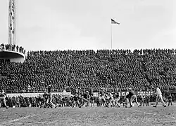 After this sporadic appearance, American football returned to Italy with the Allied troops during World War II. American football followed the advance of the US units from the south to the north of the Italian peninsula. On 23 November 1944, a touch football match was played at the Stadio della Vittoria in Bari, between the Playboys and the Technical School.[5] The trophy, called the "Bambino Bowl", was won by the Technical School 13–0 in front of an audience of 5,000.[6]