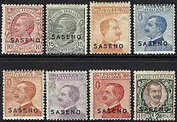During most of this period, postage stamps of Italy were in use. However, in 1923, eight contemporary stamps of Italy were overprinted "SASENO" by the Sazan Island post office for local use. These are all definitive types which show a portrait of King Victor Emmanuel III of Italy and are denominated in the Italian currency of 100 centesimi (c.) to one lira with values of 10c., 15c., 20c., 25c., 30c., 50c., 60c. and 1 lira. The values have individual colouring, mainly using shades of orange, brown and blue.[2]