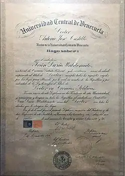In July 1939 he obtained the degree of Doctor in Political Sciences from the Central University of Venezuela, after the presentation of his thesis entitled "Credit for agricultural production: legal structure, usual forms". Among the jury were Arturo Uslar Pietri, Eduardo López V. and Tito Gutiérrez Alfaro, who recommended its publication. It was published by Editorial Condor (1939). In August of the same year, he was granted his law degree by the Supreme Court of the Federal District.