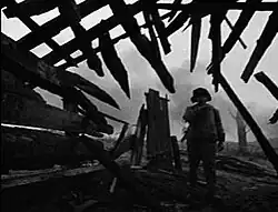 Nature takes up an important role in Ivan's Childhood. Before the film’s release, the Stalinist viewpoint on war cinema in the 1930s and 40s was that of instrumentalizing nature as a means to serve human agency in context of violence. Ivan's Childhood is produced during the stagnating period of Khrushchev thaw, and as a result instead is considered pioneer in its use of extensive and predominant representation of nature. In the film, nature is omnipresent and is captured both in Ivan’s dreams and in scenes of violence, it’s portrayed as an active witness of human violence, but also as a rebellious force itself entangled in battle, namely as a victim of war. Furthermore, Tarkovsky’s framing of nature in tracking shots was also intended as visual poetry adding a layer of artistic elegance to the film. The way in which he balances poetic representations of nature and violent narratives of war unveils his pursuit of an aesthetic representation of war,[9][10] and thus also exhibiting his distinguishing cinematographic signature.