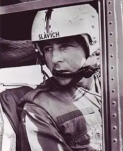 After earning his wings for fixed-wing and helicopter at the U.S. Army Aviation School at Fort Rucker, Alabama, Slavich was deployed to Okinawa with the 503rd Infantry Regiment. In 1960, while stationed in Okinawa, then Major Slavich discovered a detachment of 12 HU-1A "Huey" support helicopters. He formed a company, and worked to arm the helicopters as the French had armed theirs during the Algerian War in the late 1950s. The goal was to prove that the HU-1A (and later, UH-1B) helicopters could be sufficiently armed to provide effective close-in tactical support for troop-carrying ships.[3] Armed with four 7.62-millimeter machine guns and two rocket pods, each with eight rockets, all mounted outside the helicopter just above the skids, the firepower of the HU-1A exceeded that carried by World War II fighter planes.[4]: 204