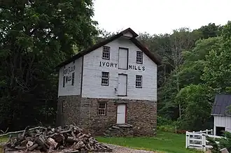 Ivory Mills is a 14-acre (5.7 ha), historic grist mill complex located at White Hall, Harford County, Maryland, United States. It consists of six standing 19th century frame buildings and structures: mill, miller's house, barn, corn crib, carriage house, and chicken house. The property also includes the ruins of a stone spring house, and the stone abutments of a frame, Federal-era covered bridge. The focus of the complex is the three-story stone and frame mill building built circa 1818. The ground story is constructed of coursed stone rubble, and the upper stories from clapboard. The family first started a mill on this site in 1781; this particular mill ceased production in the 1920s.[2]