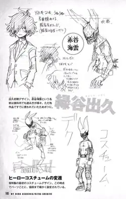 Izuku Midoriya was initially created as Jack Midoriya (Japanese: 緑谷 ジャック, Hepburn: Midoriya Jakku), an ill salaryman working for a superhero supply company. This prototype appears only in a 2008 one-shot comic written by Horikoshi called My Hero.[2] He was later changed to a high-school student for My Hero Academia (with the chronic illness repurposed for All Might's character), however, his character remains largely unchanged.[3] This prototype for My Hero Academia's main protagonist was Mikumo Akatani (Japanese: 赤谷 海雲, Hepburn: Akatani Mikumo), a black-haired Quirkless boy who would have utilized gadgets to become a hero. Horikoshi revised the design of Akatani's character, as he was especially dissatisfied with the hair and shortened it for Midoriya. Initially the protagonist was to remain Quirkless. Horikoshi changed the direction of Midoriya's character by adding his acquisition of One For All, due to suggestions from editors that argued that a powerless main protagonist would be overshadowed by other superpowered characters.[4]