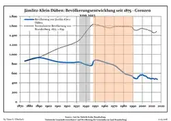 Development of population since 1875 within the current Boundaries (Blue Line: Population; Dotted Line: Comparison to Population development in Brandenburg state; Grey Background: Time of Nazi Germany; Red Background: Time of communist East Germany)