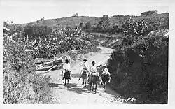 Postcard of jíbaros on horseback, traveling through a country road in Barranquitas (c. 1915)