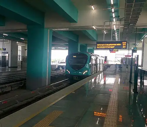 J. L. N. Stadium is a station of Kochi Metro. It was opened on 3 October 2017 as a part of the extension of the metro system from Palarivattom to Maharaja's College.[1] The station is located between Palarivattom and Kaloor.[2] The name of the station is given because of the Jawaharlal Nehru Stadium. The 11.2 km extension to Infopark via Kakkanad as a part of Kochi Metro project phase two begins from J. L. N. Stadium station. The corporate office of Kochi Metro Rail Limited is also located at this station.[3]