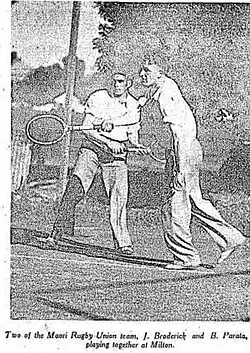 Brodrick was then selected as one of twelve Bay of Plenty players to play in a New Zealand trial match at the Oval in Gisborne. The other eighteen players chosen to make up the two sides were from the Gisborne-Poverty Bay area. From this trial it was intended to choose a team to play a Hawkes Bay-Bush side which would assist the New Zealand selectors in choosing the touring side to tour England.[40][41] The Possibles whom Brodrick was playing for won the match 19 to 9.[42][43] The Gisborne Times said that Brodrick was one of the best of the forwards in the match though all played well.[44] Brodrick however missed out on selection for the following match. George Nēpia played in the match and it was reported afterwards that he had received an offer to switch to the rugby league code. He would stay with rugby union at the time but later did make the switch and played with Brodrick at Manukau as well as with New Zealand Māori and New Zealand.[45][46]
