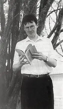 Ross in 1998, holding a copy of his poetry collection, City of Strange Brunettes, published that year