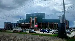 A view of Lambeau Field from Lombardi Avenue with a monument to Vainisi on the right in the foreground.