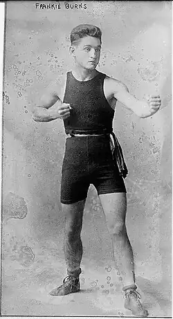 Sharkey met Frankie Burns seven times during his career, but had little luck with the highly rated bantamweight contender. Beginning on November 27, 1916, Sharkey faced a ten-round loss by newspaper decision from Burns in New York, followed by a ten-round loss on February 9, 1917, at the Harlem Sports Club in New York by newspaper decision of the New York Sun. Sharkey sank to the mat in the sixth round and claimed a foul, though he recovered by the seventh. He fought the first two rounds "like a whirlwind" and looked to have an advantage, but lost his pace in subsequent rounds.[8] In the third, Sharkey was stunned by a left hook to his midriff that may have affected him for the remainder of the bout.[9]