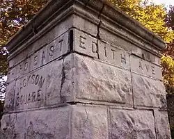 The stone monuments included embedded Jackson Square name plaques, along with appropriate street name plaques on two sides. They were also capped with orbs. Today, only one monument remains standing; it is on the southwest corner of Edith and 300 East, though the original orb is missing. The base of another pillar can be found on the southeast corner of Hampton and 200 East.