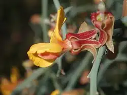 Jacksonia rigida is an erect to sprawling, sturdy shrub or small tree that typically grows up to 0.3–6 m (1 ft 0 in – 19 ft 8 in) high and 1–4 m (3 ft 3 in – 13 ft 1 in) wide. It has greyish-green branches with scattered, sharply-pointed branchlets 5.8–22 mm (0.23–0.87 in) long and 1–2 mm (0.039–0.079 in) wide, its leaves reduced to egg-shaped, dark brown scales, 0.7–1.4 mm (0.028–0.055 in) long and 0.9–1.4 mm (0.035–0.055 in) wide but that usually fall off as the branchlets mature. The flowers are arranged singly on the branches or on short side-shoots on a pedicel 3.4–7.3 mm (0.13–0.29 in) long, with broadly egg-shaped bracteoles 0.6–1 mm (0.024–0.039 in) long and wide with irregular edges. The floral tube is 1.5–2.3 mm (0.059–0.091 in) long and the sepals are membranous, with lobes 8.4–10.8 mm (0.33–0.43 in) long, 1.2–2.1 mm (0.047–0.083 in) wide and fused for 1.2–1.3 mm (0.047–0.051 in). The standard petal is yellow-orange with red markings, 7.2–8.9 mm (0.28–0.35 in) long and 8.1–10.2 mm (0.32–0.40 in) deep, the wings are yellow-orange with red markings, 9.3–10.1 mm (0.37–0.40 in) long, and the keel is red, 8.2–8.9 mm (0.32–0.35 in) long. The stamens have green filaments, 6.5–11.1 mm (0.26–0.44 in) long. Flowering occurs from April to November, and the fruit is a woody, densely hairy, curved and flattened pod 7.5–9.5 mm (0.30–0.37 in) long and 3.5–3.6 mm (0.14–0.14 in) wide.[2][3]