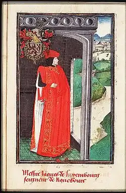 Jacques was the son of Peter I, Count of Saint-Pol and Margaret of Baux.[1] He fought beside Arthur de Richemont, Constable of France, at Formigny.[1] He was knighted after the Battle of Gavere on 23 July 1453. In the following years, he served Charles the Bold, Duke of Burgundy as an army commander. In 1468 he was awarded the Order of the Golden Fleece.[1] Supporting the Burgundians, Jacques was wounded and captured by the French near Arras.[1] While convalescing in Paris, he agreed to serve Louis XI and was made chamberlain.[1] He received the French Order of Saint Michael.[1]