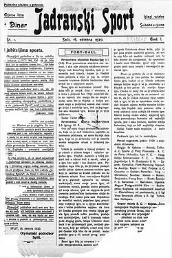 Jadranski Sport (transl. Adriatic Sport) was a weekly sports magazine published in Split, which was then part of the Kingdom of Serbs, Croats and Slovenes. Published by the Split Olympic Sub-Committee, it was an independent weekly for the first nine issues. After the tenth issue, it became a weekly supplement to the Novo Doba daily newspaper. The magazine's editor was Bogumir Doležal.[1]