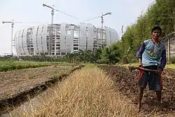After multiple series of failed planning and construction, the land dispute was over and it was ready to be cleared for construction in 2017, and buildings of former squatters was later demolished. Two years after the land was cleared, an official plan was released for a stadium of 82,000 capacity with a retractable roof and without a running track, unlike the previous project designs over the years. The newly designed project was given the name 'Jakarta International Stadium' and broke ground on 14 March 2019 with Jakarta Governor Anies Baswedan kicking off the construction.[13] Since the construction has started, the affected neighbouring residents of Kampung Bayam has asked for compensation for damages and most residents has moved out of the area.[14][15]