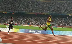 The August 18 semifinal round placed Bolt in the second heat versus seven other athletes. He placed ahead of all of them again with a time of 20.09 seconds, specifically defeating Crawford (20.12 seconds) and the United States' Wallace Spearmon (20.14 seconds). Overall, fifteen semifinalists finished the race, and Bolt ranked first. He progressed to the final round.[10] During this last race, which took place on August 20, Bolt took the gold medal with a time of 19.30 seconds, which set a world record in the process.[10] He broke the world record previously set by Michael Johnson at the 1996 Summer Olympics.[8]