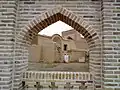 The stucco mihrab is half-octagonal in plan and is decorated with geometric and floral patterns as well as Kufic inscriptions. The remains of an older stucco mihrab with geometric patters were found on the qibla wall of the eastern prayer hall. The arcades facing the courtyard are closed with wooden doors shaped like pointed arches. Under the arch of the portal leading into the main prayer hall is a Kufic inscription in brick dating from the Seljuk period; this inscription was later covered.[4]