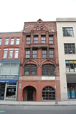 Clough's architecture retains a legacy on High Street from a handful of remaining buildings today, including the Latino Professional Building on the opposite corner of Dwight and High from where the Marble Block once stood. Originally called the Ball Block for druggist Charles Ely Ball who operated his store out of there, the block was built in 1898.[10] During the 20th century the building saw its first two floors modified extensively for the Holyoke National Bank which moved into the building in 1915, and subsequently modified it to its present appearance.[11] In 2005 it was renovated by the New England Farm Workers' Council and rechristened The Latino Professional Building, receiving an award from the Massachusetts Historical Commission for its attention to original detail.[12] The building's architectural details show influence Clough drew from Italianate palazzo style architecture, notably in its pillared corner windows, ornate capitals and cornices.