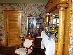 Lumberman Simmons' utilized oak extensively throughout the house. Features include a built-in oak china cabinet, carved oak newel posts, dentil molding, extensive oak panels, oak pocket doors, and oak flooring.