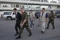 U.S. Ambassador to Haiti James Foley with Chairman of The Joint Chiefs of Staff General Richard B. Myers at Port-au-Prince International Airport, March 2004.