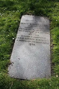 Although he inherited his father's tobacco plantations and estates, including Drumpellier on his father's death in 1759, he was ruined in 1777 following the American Revolution. He sold the bulk of his estates to his cousin, Andrew Stirling (of William Stirling & Sons).[2] The estate was reacquired by James' nephew, David Buchanan in 1808 (later known as David Buchanan Carrick).[3]
