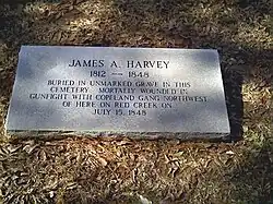 On July 15, 1848, James Copeland and his gang rode to James Harvey's home on Red Creek in Perry County (now Forrest County), Mississippi. They had been offered one-thousand dollars by Wages' father, to avenge his son's death. Here, the Copeland clan fought a blazing gun battle, which resulted in the death of Harvey and one of Copeland's men.[4] Friends carried the mortally wounded Harvey to John Dale's home in northwestern Harrison County (now Stone County), where he died several days later and was buried in the nearby Dale Cemetery. In 1974, Harvey's remains were exhumed and reinterred in Pearl River County, Mississippi.[5]
