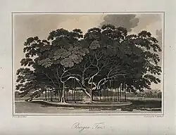 Banyan tree (Ficus benghalensis) with many spreading aerial roots. Aquatint by T. Medland, c. 1807, after J. Cordiner