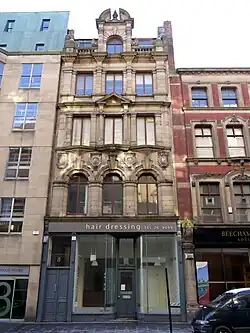 At some point he met the Newcastle physician Dennis Embleton, who often prescribed an effervescent compound of sodium bicarbonate and citric acid.[3] Mixtures of this type, combining a fruit acid with a carbonate or tartrate, were known as fruit salts, and they were marketed for a wide range of ailments, only a few of which (e.g. indigestion) they could actually ameliorate. Eno set up his own pharmacy in the Groat Market area of the city and in 1852 began selling his own fruit salt mixture.[3][5][6] Eno gave away his compound to seafarers at the port, and in this way the name Eno became associated with fruit salts around the world.[3] In 1868, he formally founded the company Eno's "Fruit Salt" Works.[3][7][8]: 253