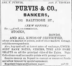 In 1869 a James F. Purvis (unclear if Junior or Senior) announced for that he had rented Room 8 over the telegraph office at the southwest corner of Baltimore and South streets for the "purpose of buying and selling on commission STOCKS, BONDS, GOVERNMENT SECURITIES, where he would be happy to see his old friends and customers. All orders promptly attended to."[53]