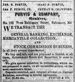 At the time of the 1850 U.S. census, his occupation was exchange broker and he owned $40,000 in real estate.[2] On the 1850 slave schedules he was listed as the legal owner of three people, a 26-year-old female, an eight-year-old boy, and five-month-old baby girl.[39] Purvis was president of Howard Bank by 1856, when agents of the bank published a notice announcing a $100,000 stock offering.[40] In 1856 a real estate listing described a Baltimore property listed for sale as being located near "that splendid mansion" of James F. Purvis.[41] In December 1856 he was one of the gentlemen who would be calling around Christmastime "on the citizens of the Eighth Ward for their contributions to the city association for the relief of the suffering poor."[42] In 1858 and 1859, he was involved in the anti-municipal corruption City Reform Association.[43][44][45]