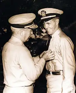 Kauffman (left) presents his son Draper L. Kauffman with a Gold Star in lieu of second Navy Cross for heroism under fire during the U.S. invasion of the Mariana Islands, 1 September 1944.