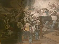 After Lawrence's death was reported to his friend and fellow officer Oliver Hazard Perry, he ordered a large blue battle ensign, stitched with the phrase "DONT GIVE UP THE SHIP" [sic] in bold white letters. The Perry Flag was displayed on his flagship during a victorious engagement against the British on Lake Erie in September 1813.[1] The original flag is displayed in the Naval Academy Museum and a replica is displayed in Memorial Hall at the United States Naval Academy in Annapolis, Maryland. A replica is also on view at Perry's Victory and International Peace Memorial, on South Bass Island, Ohio.