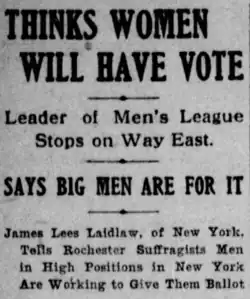 Three years after the New York Men's League office opened there were 23 other states with chapters. Laidlaw led the development of a convention in Philadelphia soon after assuming the leadership position, followed by the December 1913 convention in Washington, D.C.[14] Within the state of New York, the League's goal was to ensure that every man in the state that supported women's suffrage become a member of the Men's League.[14] Laidlaw led the proceedings of the men's night of the 4th annual National American Woman Suffrage Association (NAWSA). Several members of the national men's league, with 23,000 members, spoke to the political and economic reasons why women should have the right to vote. Specifically, as women obtained secondary education entered the workforce, it does not make sense that women would not have the right to provide input on issues related to their fields or trades.[15] In 1911 and 1914, Laidlaw and his wife when on two speaking tours to promote women's suffrage in the western states.[12]